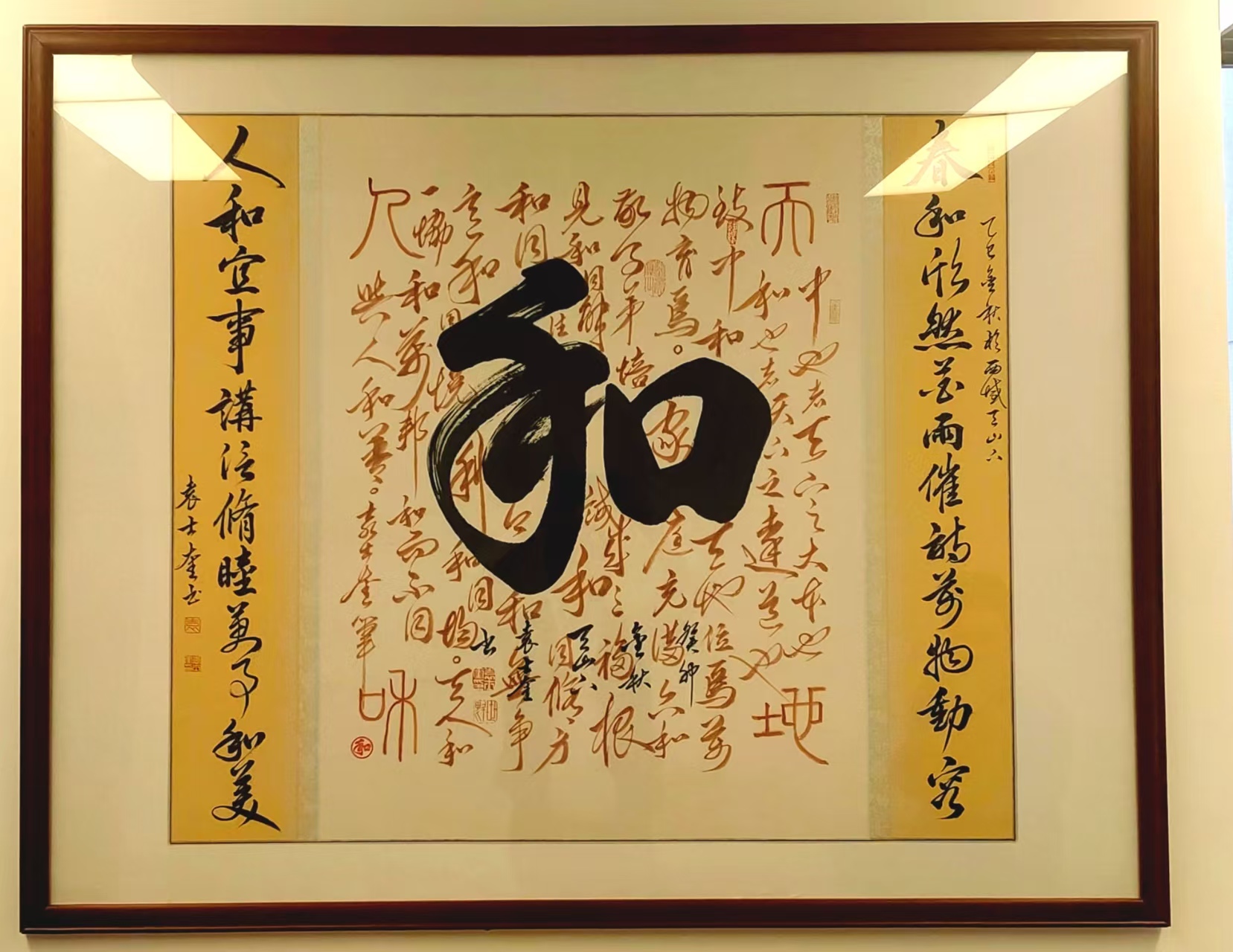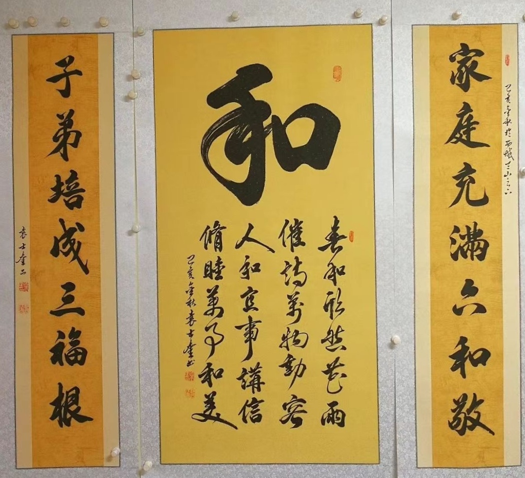 一个“和”字,衍生出的丰富厚重的“和”文化:从和睦家庭、和谐社会、和美新疆到和平中国,从和颜悦色、和蔼人际、和气生财到和和美美……“和”文化其实已如春雨于无声处渗透到我们的工作与生活,而以“和”文化书法艺术传播中华优秀传统文化,堪称最接地气的文化弘扬。习总书记说“中华优秀的传统文化,是中华民族的根与魂”。袁士奎以自己书法创作文化艺术活动,践行传播着中华传统文化,文化润疆,培根铸魂,讲好新疆故事,为构建和谐社会,彰显着积极正能量。