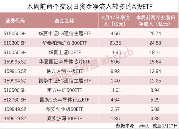 Wind数据显示,3月17日主要宽基指数ETF继续吸金,华泰柏瑞沪深300ETF净流入约23.35亿元,华夏上证50ETF、南方中证500ETF分别净流入11.90亿元、11.01亿元,易方达创业板ETF净流入9.92亿元。