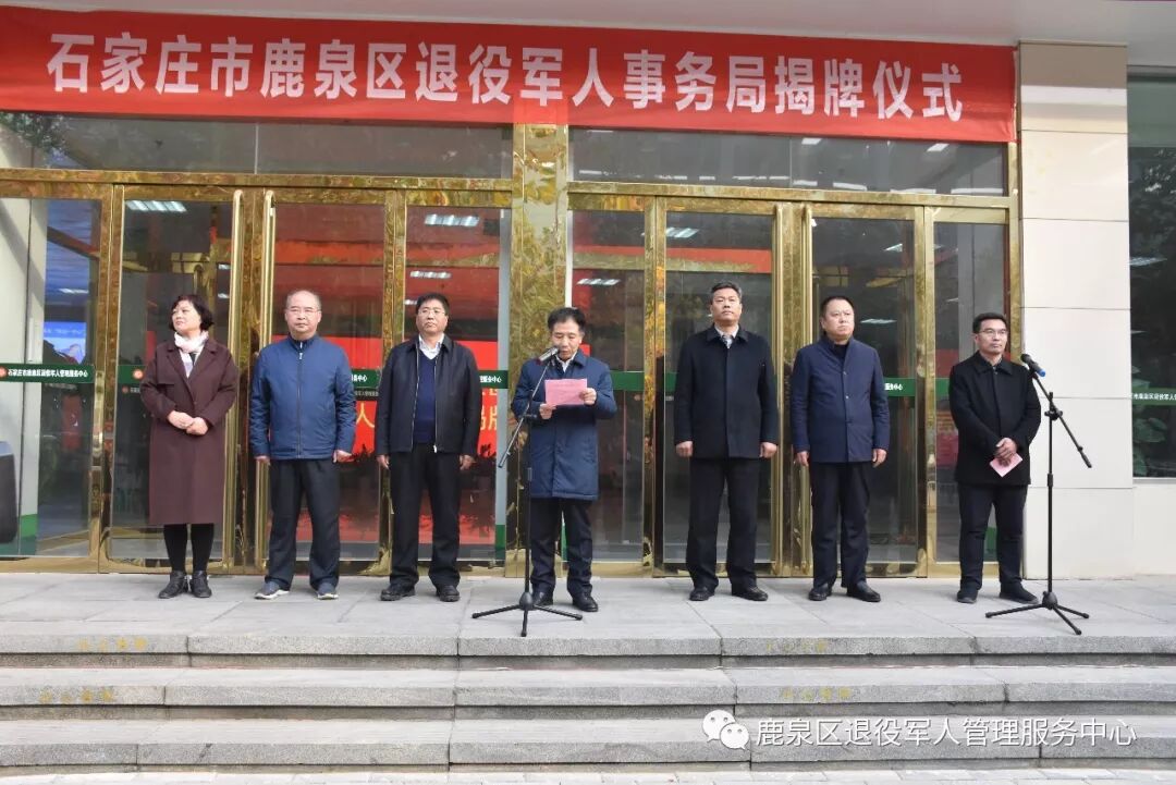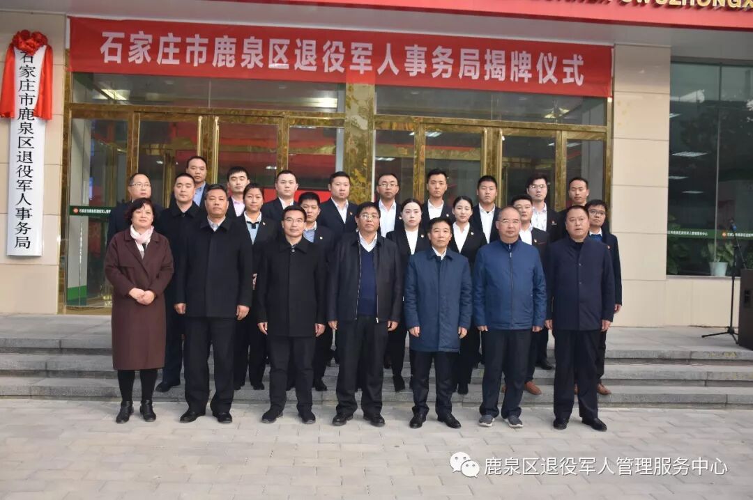 2018年11月26日下午,石家庄市鹿泉区举行退役军人事务局揭牌仪式,区委书记杨国芳,区委副书记、区长李为军,区委副书记金立兴,区委组织部长张海峰,区人大副主任王志勇、副区长、公安局局长温玉祥、区政协副主席张会芳出席了揭牌仪式,参加揭牌仪式的还有区直相关部门负责人及退役军人事务局工作人员。