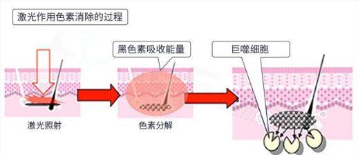 激光,英文为Laser,译音是镭射,将瞬间爆发出的巨大能量置于色素组织中,然后把色素打碎并分解,使其可以被巨噬细胞吞并掉,随着淋巴循环系统排出体外,达到将色素去掉的目的。