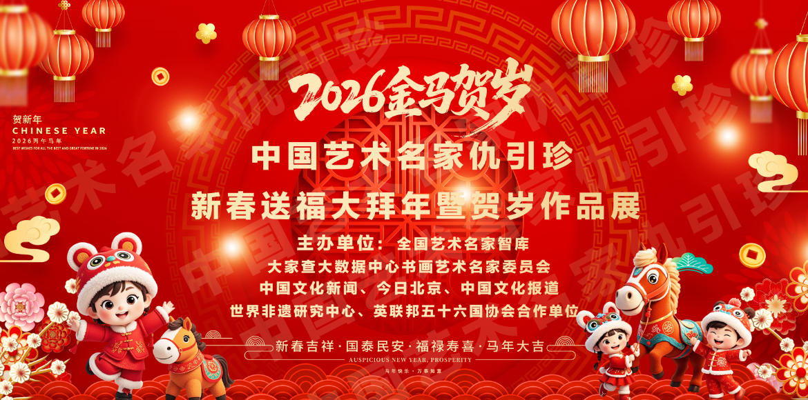 春启新章,马跃宏图;墨韵传福,艺贺中华。值此乙巳辞旧、丙午迎新,金马踏春、福满神州之际,2026 中国艺术名家新春送福大拜年暨贺岁作品展如约启幕,诚聚艺坛翘楚,共赴新春艺宴,以笔墨寄情,以丹青贺岁,以艺术之名传递龙马精神,敬献马年美好祈愿。